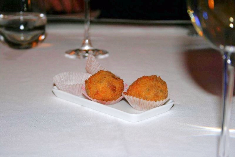 Friday night we dined at the Ristorante Via del Borgo, which wasn’t at all easy to find. After we’d corkscrewed around the one way system of Corcorezzo (which seems to resemble something designed by Escher) we eventually homed in on it, though I’m not sure I could find it again! Anyway, it’s rather different to the Derby Grill, being a long, high ceilinged space that seems to have been built into what was once the colonnaded outer section of a building. It’s clearly an old structure, but it feels modern, as does the food. Where the Derby was olde worlde style both in decor and cooking, this is something very different. This time we all went for the menu degustazione, starting with some rather entertaining meatballs as an amuse bouches.