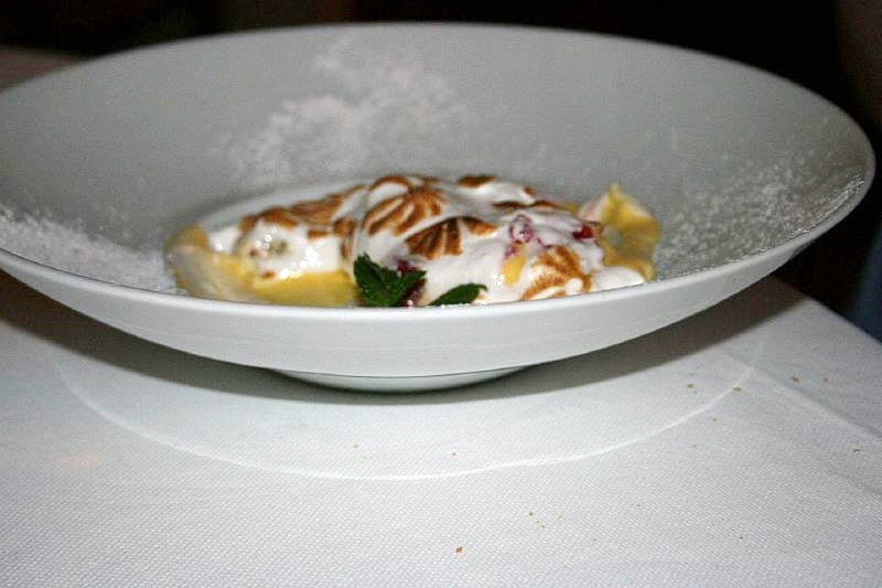 And we were finally at the main course, a choice of fish or meat. The fish (scaloppa di sanpietro al profumo di camomilla con vinegrette di rape rosse) was a beautiful fillet of St. Pierre, with a camomile-perfumed sauce and a beetroot vinaigrette.