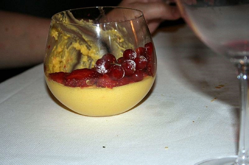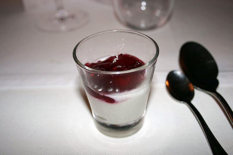 But they hadn’t finished with us. Next up were the pre-desserts, a portion of sweetened goats cheese, with a fruit sauce…