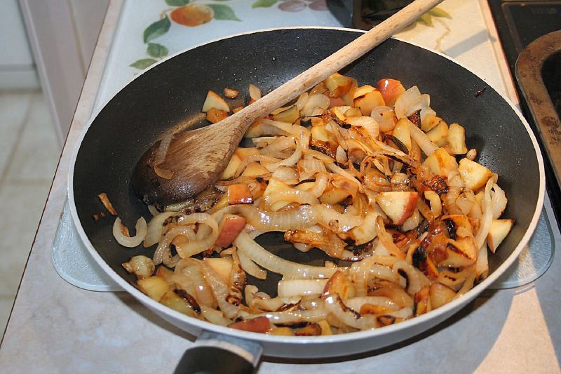 2. Heat the oil in a frying pan over a medium heat. Add the pears and the onion and fry until golden and soft.