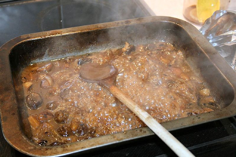 8. For the dressing, skim off any fat from the remaining roasting juices and place over a high heat to reduce the liquid by half.