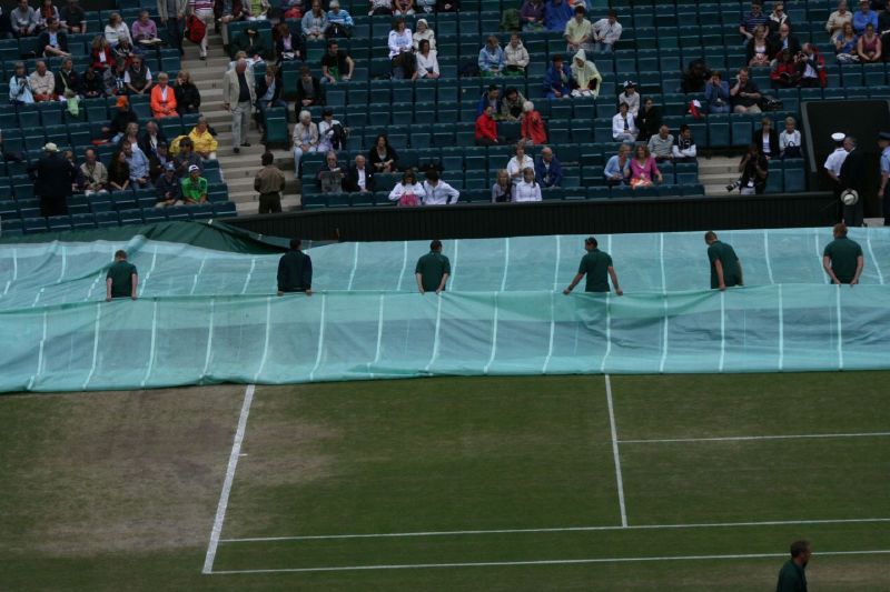 As we settled into our seats the rain that had been threatening (and threatened in the weather forecast) arrived and there was a rush to cover the court. An announcement suggested that there would be no play before 4pm, unless things improved, in which case play would start as soon as possible. We opted to stay put at the back and start lunch (Pret a Manger’s sandwiches, strawberries, fresh fruit, a lovely white Zinfandel, and plenty of water). And it wasn’t long before our patience was rewarded. Around 1.00 the sky got considerably lighter and the court workers all turned up and removed the covers and began to set everything up for the first match.