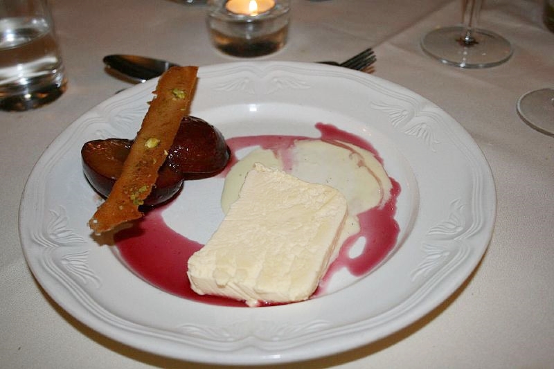And then there was dessert… Iced amaretto parfait with poached plums and pistachio biscuit, sticky and wonderfully light, soft, melting in the mouth.