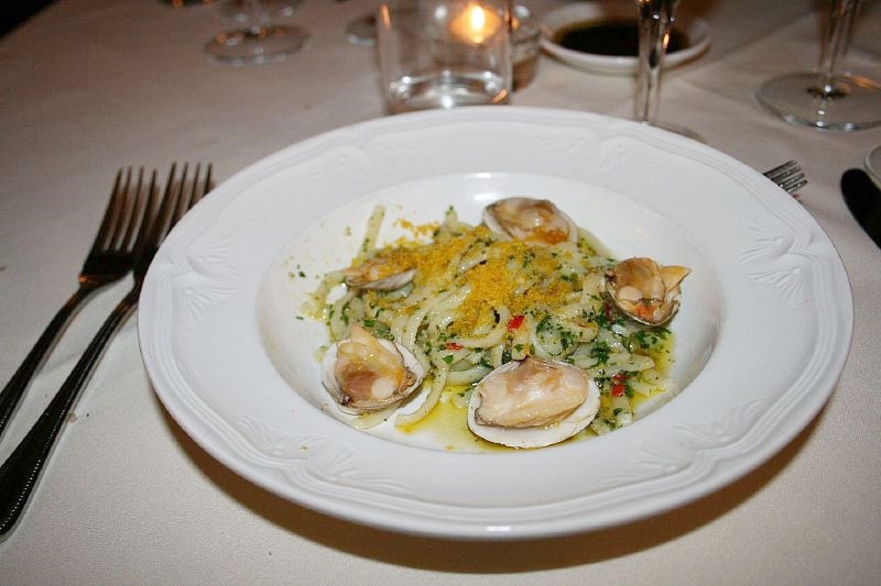 We moved on both in wine terms and in food terms, with a pasta course, thankfully not on the same sort of scale that our friends at Val Taro insist on serving. No, this was half a dozen clams, and a deal of bottargo, served with linguine, with a smattering of pesto. The wine was a Toledana Gavi, Raccolto Tardivo 2007 and again it was very good.