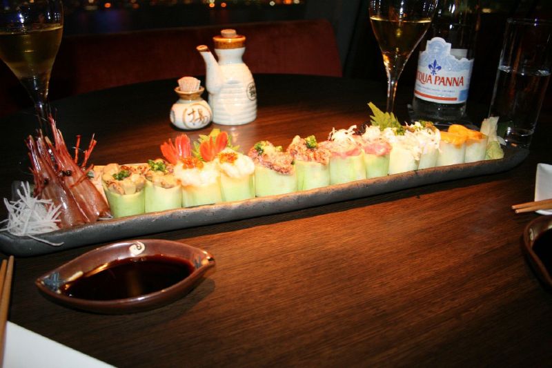 I like the service though. You’re met at the door, shown to a lounger (the gym attendant puts a towel down for you, brings you a large glass of iced water, and produces a hot towel for you to wipe your face/hands down on). Glyn came back from his business meeting to just as we were getting ready to go down for cocktails and the staff didn’t bat an eyelid at us bringing a third person in for cocktails… Once we’d done a pass round the canapés and it was time to go for dinner, Glyn grabbed a ride on the shuttle bus to the airport express and that just left the two of us. We’d booked a table in Aqua again, intending to hit the Japanese menu this time, though we were briefly tempted by the set menu, till we realised just how much food it would entail and we bottled out. Once again we started with a pair of raspberry caipirinhas, and then branched out with a plate of sushi between us.