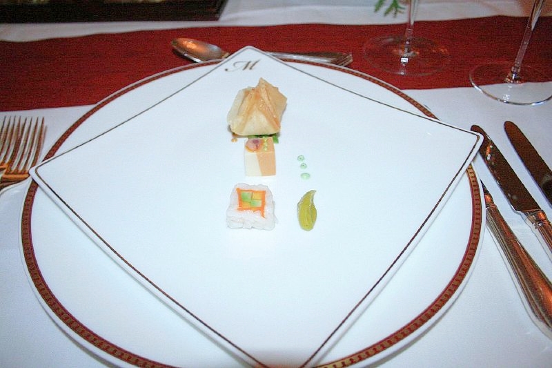 Next came a splendid foie gras terrine in a very thin, sweet pastry case, served with some delicate salad leaves on a truffle vinaigrette.