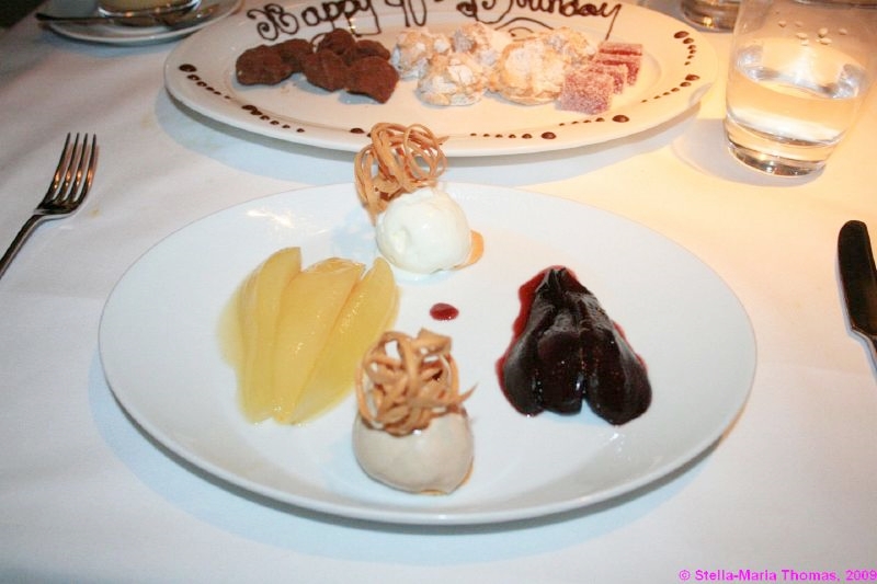 However, the poached pears were my choice, one done in red wine and one in white, with cinnamon ice cream and mascarpone ice cream, prettily decorated with some biscuit spirals. It went down a treat, although by now I was beginning to suspect I might never manage to eat again (or in fact need to).