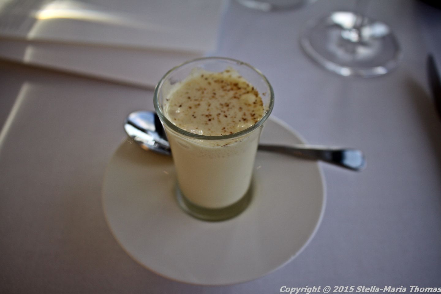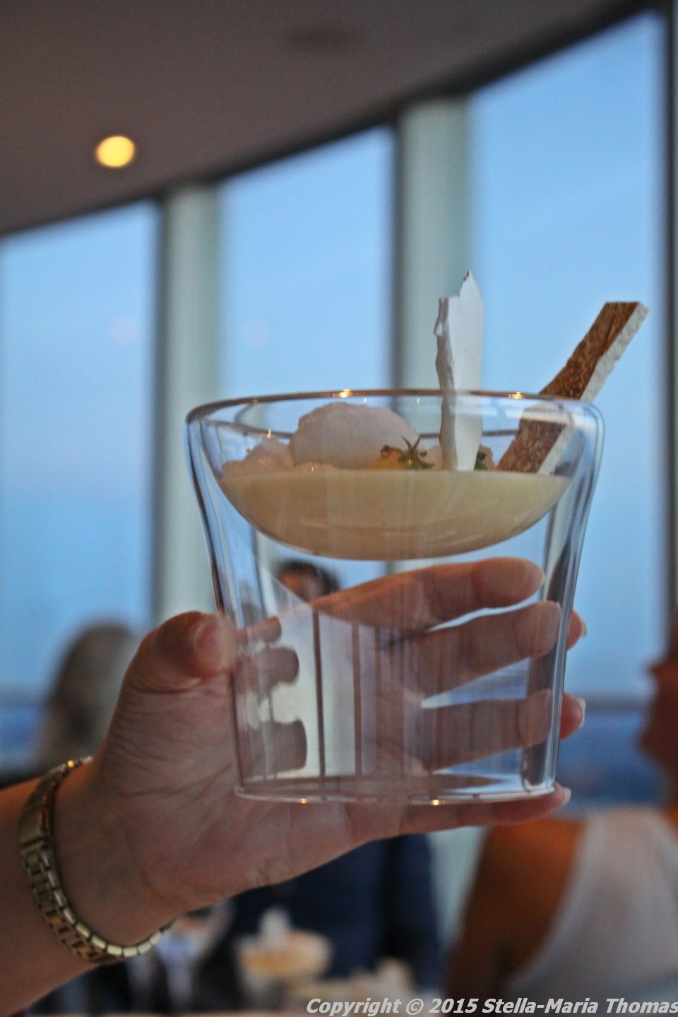 Shortly afterwards we were invited to go to our table and thus we were taken up another level to the revolving 34th floor and seated ready to begin dinner. We started with a relatively substantial amuse bouches of caulifower velouté with a baked Parmesan foam and cheese straws. It was very rich and very cheesy with a interestingly bitter edge from the cauliflower and the Sauvignon Blanc we ordered to go with it matched it very well.