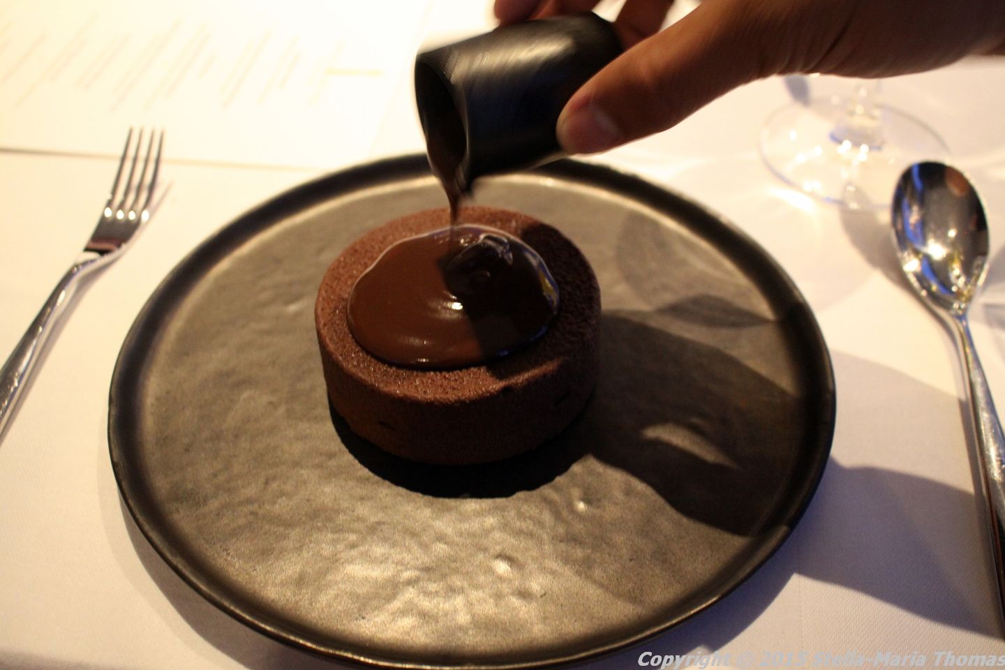 This was a dark chocolate custard which had a crunchy hazelnut coating, wrapped around a white chocolate ganache, with a disk of chocolate on the top decorated with a gold leaf logo of the tower. A hot chocolate sauce was poured over it and we all quietly descended into a chocolate induced semi-trance where all you could hear were gentle sighs and moans.