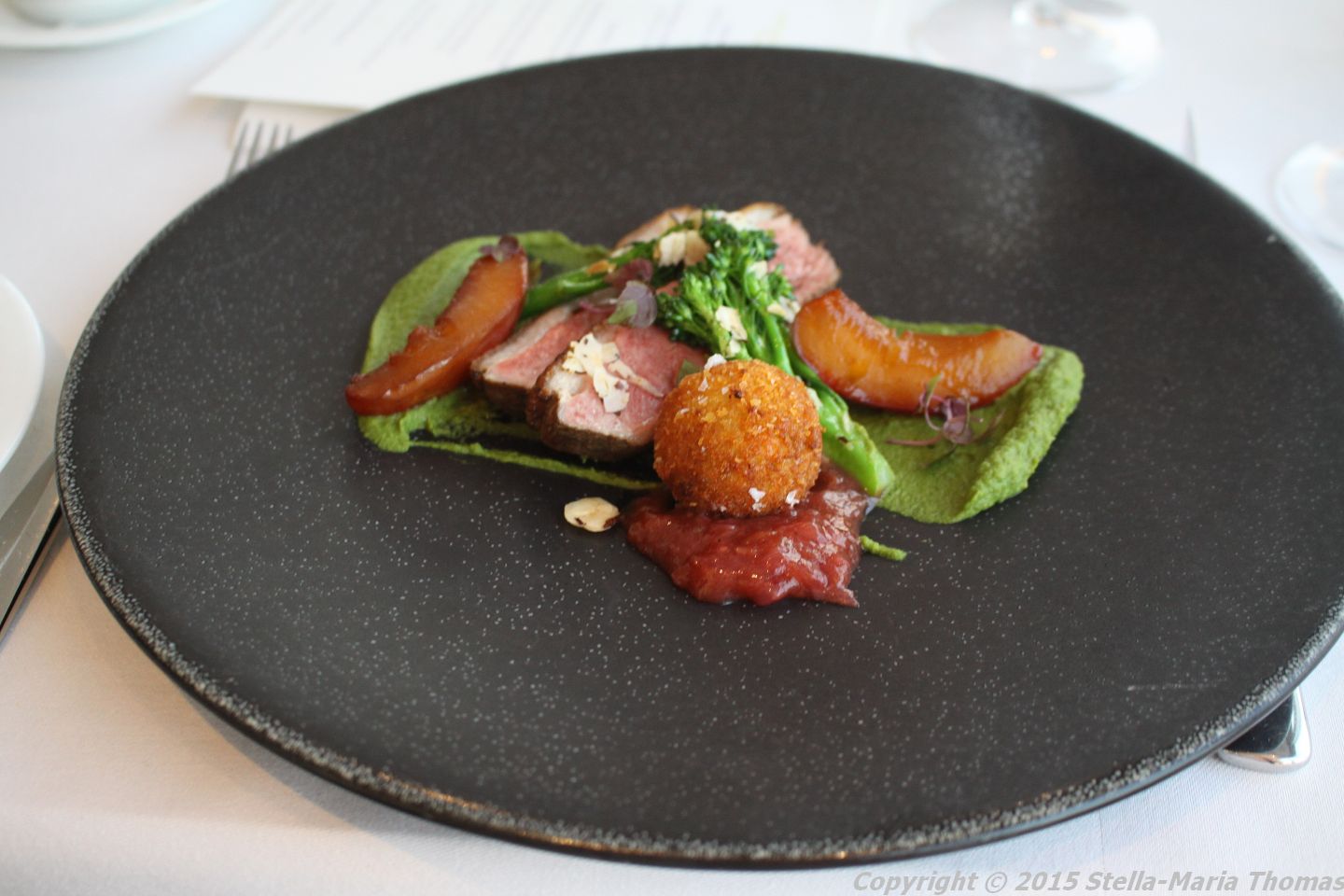 With it we were served spiced Gressingham duck breast, with crispy confit leg (the meat shredded and shaped into a small bread-crumbed meat ball) with tenderstem broccoli both pureeed and in its original form, hazelnut and plums. I particularly liked the crispy confit, and the plum together, but it was all enjoyable.