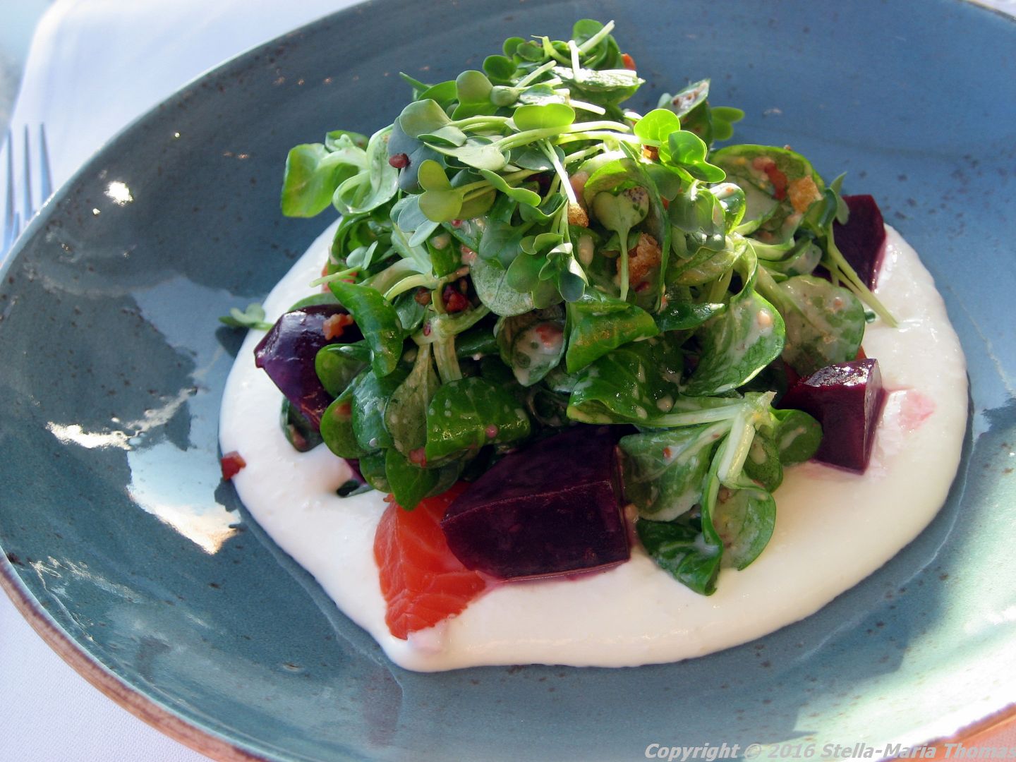 dachgarten-restaurant-reichstag-fjord-trout-and-sour-crea-with-horseradish-beetroot-lambs-lettuce-potato-bacon-dressing-berlin-006 Posted by Stella on 23/12/2016