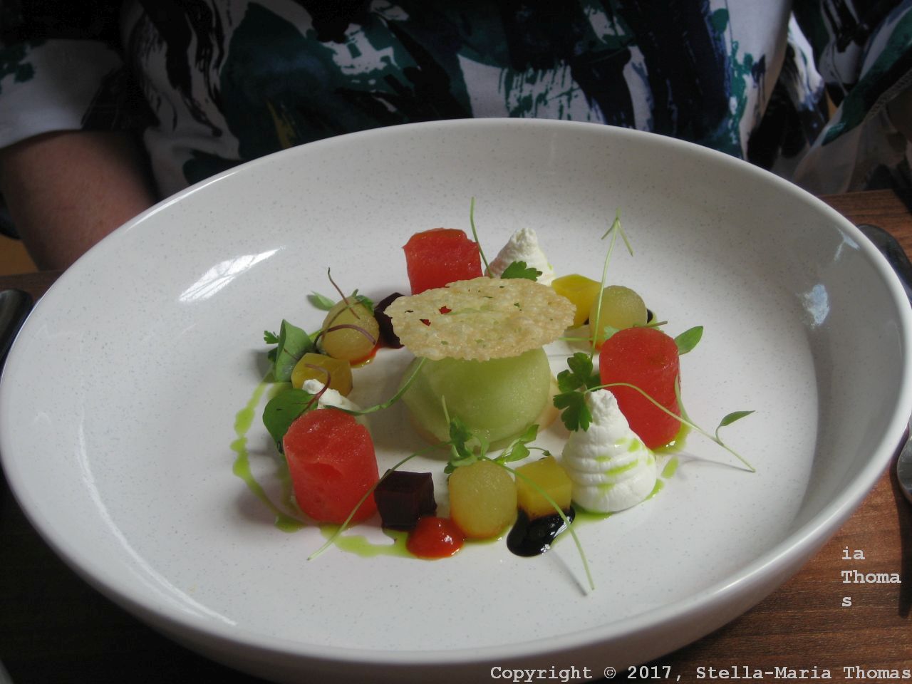 RASCILLS, SUMMER SALAD (CUCUMBER SORBET, MELON, BEETROOT, APPLE, WHIPPED GOAT’S CHEESE) 002 Posted by Stella on 28/06/2017