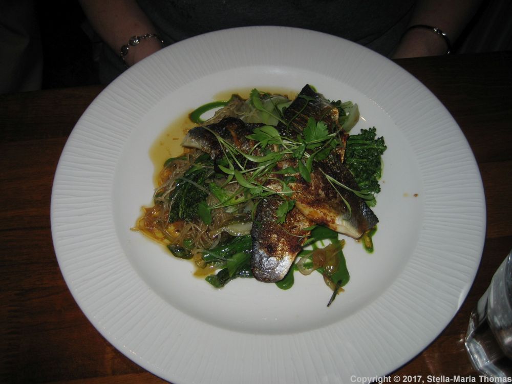 The “three piggies” was probably the best part of the meal. I ordered the game and red wine ragu, which was served with pappardelle, parsley and Parmesan. The texture of the ragu was fine, but it lacked depth, and needed a lot of salt and pepper adding to perk it up, and I didn’t notice anything beyond the merest hint of Parmesan. Lynne wasn’t too impressed by her baked sea bass either, again finding a lack of depth of flavour to be a problem. Ginger, soy and chilli ought to at least pack a bit of a punch, but this was just a bit bland.