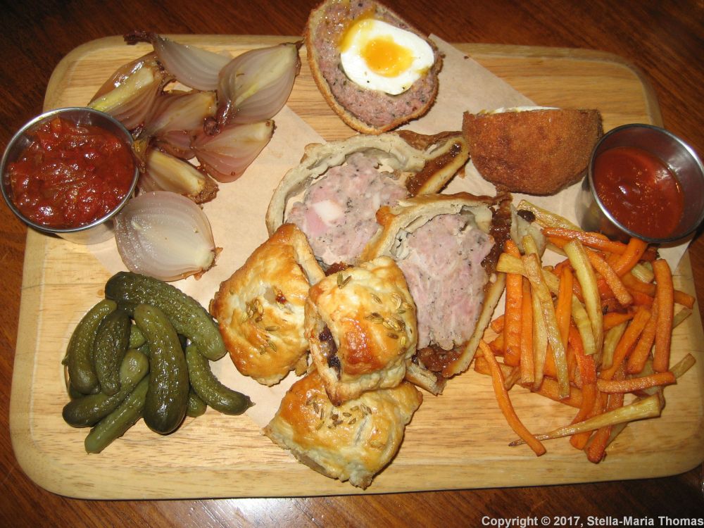 We opted to share the “Three Little Piggies” platter which came with a saltimbocca scotch egg, slabs of old english and black pudding sausage rolls, and slices of pork and apricot chutney pie. It was accompanied by pickles, root vegetable and rosemary fries and some tomato chutney. Parts were great, the sausage rolls in particular, but the fries, while tasty, were limp and soggier than is good in a fry.