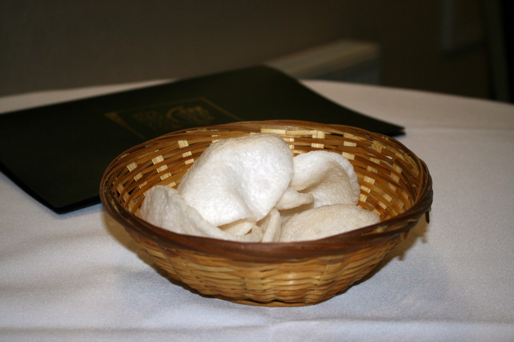 The following night we headed out to our favourite Chinese, the Rice Bowl in Towcester. We’ve been going there since 1988 so clearly we like it, and we enjoy the food in the restaurant enough that we tend to end up in there at least five or six times a year if not more often. And so it was that we headed in to see what took our fancy this time. No matter what you order, in good old-fashioned Chinese-restaurant style there is always a basket of prawn crackers and today was no exception.