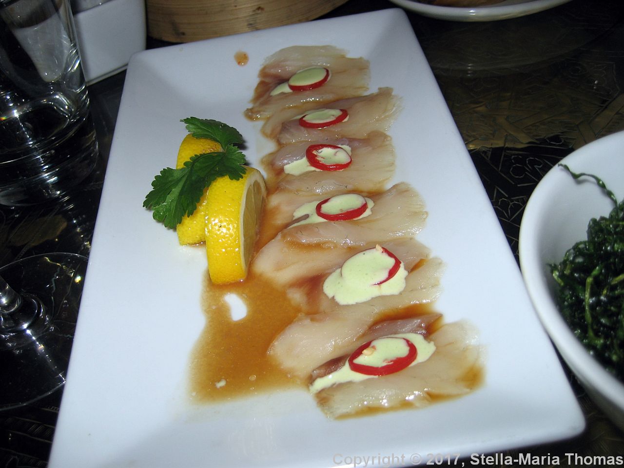 CRAZY BEAR, STADHAMPTON, MODERN STYLE SEABASS SASHIMI, CHILLI, CRISPY GARLIC, CORIANDER AND PONZU SAUCE 011 Posted by Stella on 06/08/2017