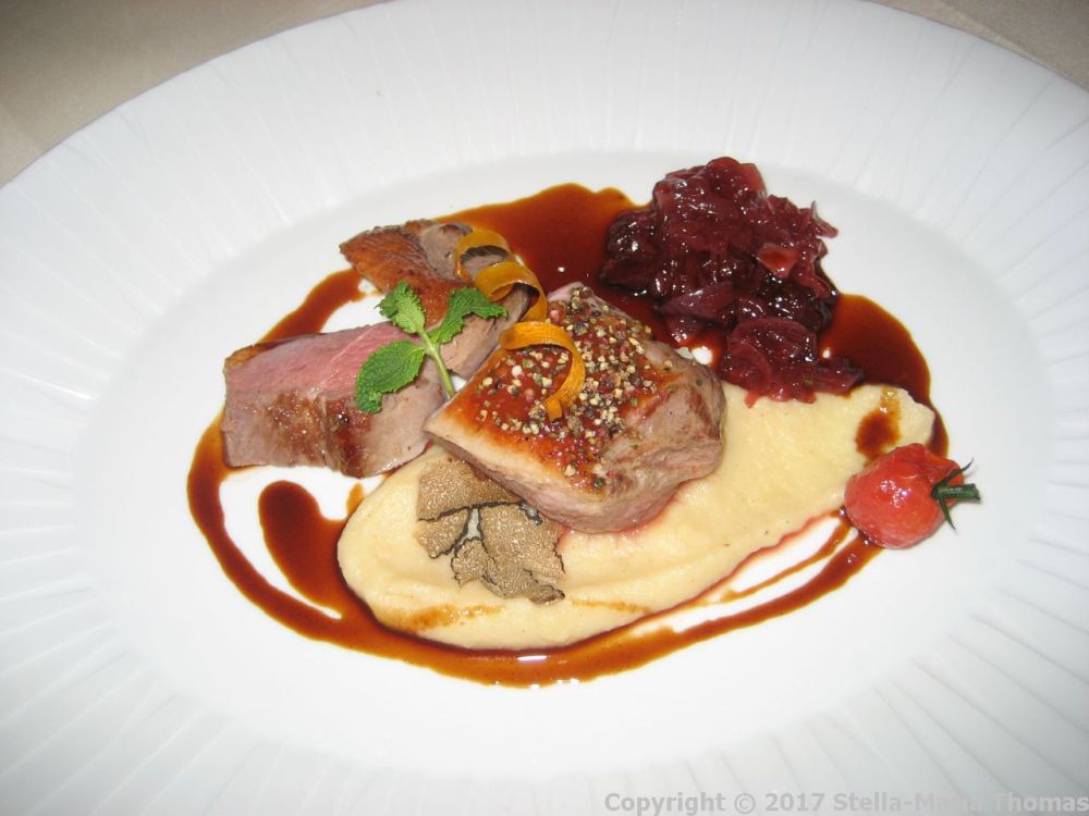 And so, as planned the day before, we duly presented ourselves at Saxler’s Restaurant in the Hotel St. Stephanus for what promised to be a far better dinner than we’d had the night before! Not that that would have been difficult. The charming lady, who I suspect may have had Eritrean heritage given how much she looked like someone I know in Dusseldorf who does, who seated us was soon back with a glass of sekt and the menus, and it didn’t need much study to suspect we were in safe hands.