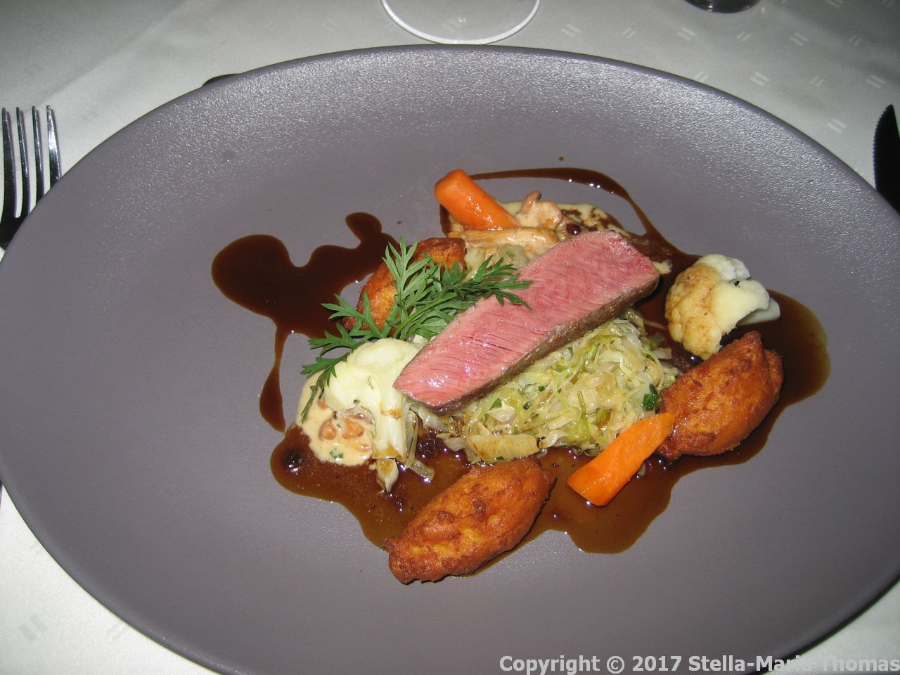 OLIVER’S RESTAURANT – PINK COOKED RUMP OF VENISON WITH HISPI CABBAGE, LINGONBERRY SAUCE AND PUMPKIN-POTATO CROQUETTES 008 Posted by Stella on 09/11/2017