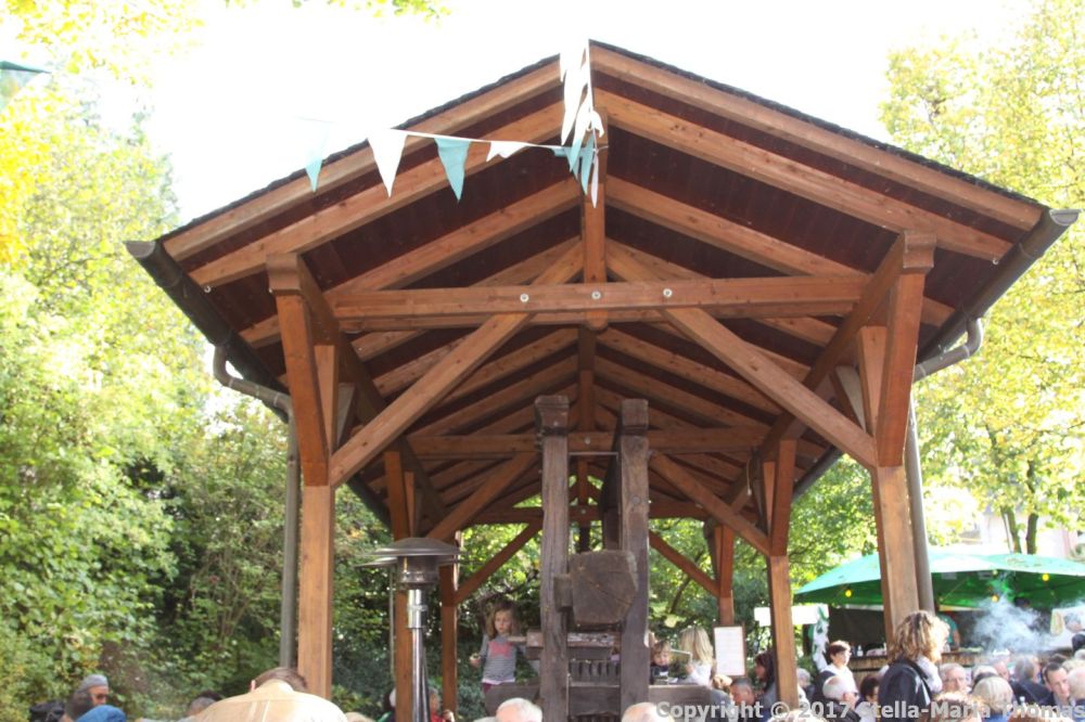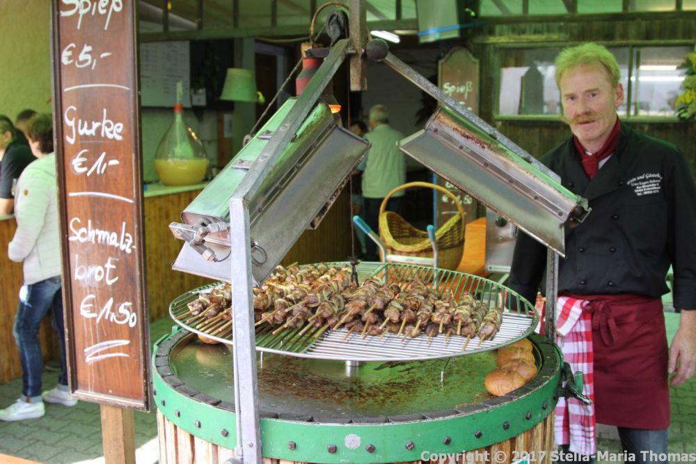 After snagging what might well have been the last parking space in Erden, we found our way in to the village centre, where pretty much every winemaker had set up a strausswirtschaft in a barn, or a cellar or just in a tent, and were serving zwiebelkuchen, things you can grill, and a selection of wines. There were some very creative setup including a winepress being used as a barbeque grill, and everywhere people were enjoying the sunshine and knocking back the wines.