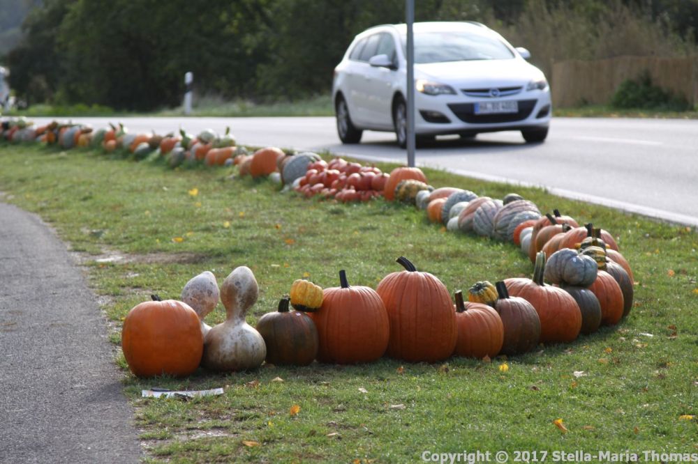 I drove back the quick route, having been hampered at every turn by tractors pulling cart loads of grapes, and a little old lady in a VW who should probably not be behind the wheel any longer if her 15 mph progress and repeated indicating then not actually turning off was anything to go by! There was also a second sighting of the pumpkin seller on the approach to Kinheim, whose wares were spread out along the grass verge. Some of them were very odd looking!