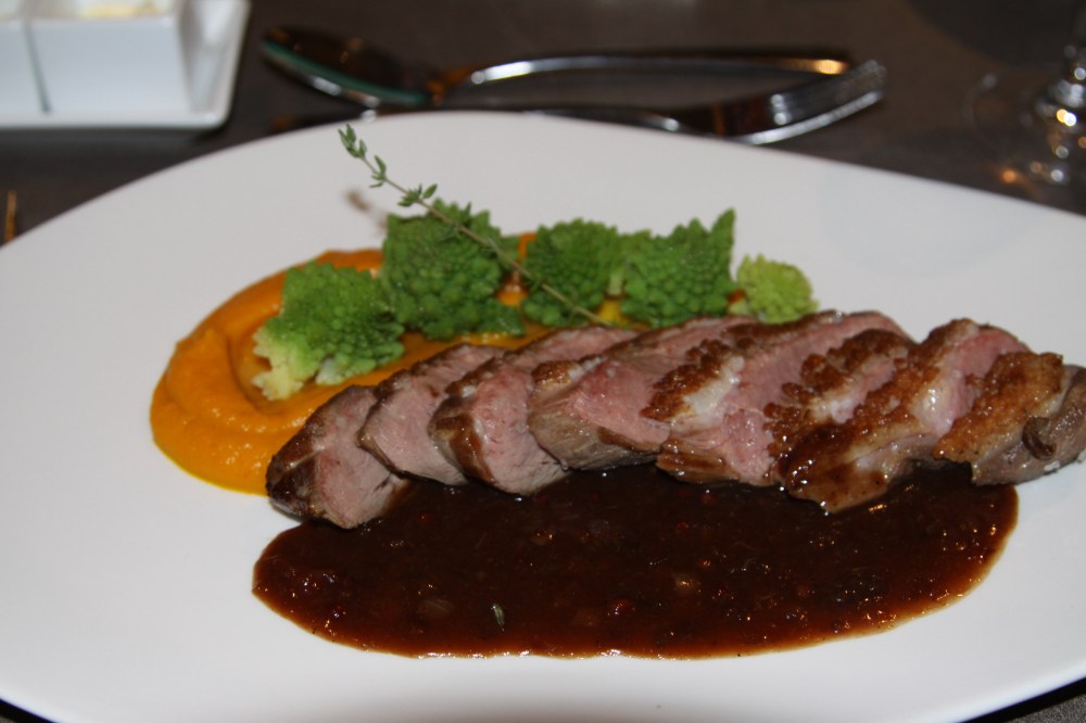 We also had the same mains, a pink-roasted duck breast with a plum and pepper sauce, romanesco cauliflower and a pumpkin puree. Unlike what often happens in the UK, the duck genuinely was cooked pink, as it should be, and was all the better for it. The sauce was glorious, shiny and unctuous, and the sweetness of the pumpkin puree nicely contrasted the sharp fruitiness of the sauce.