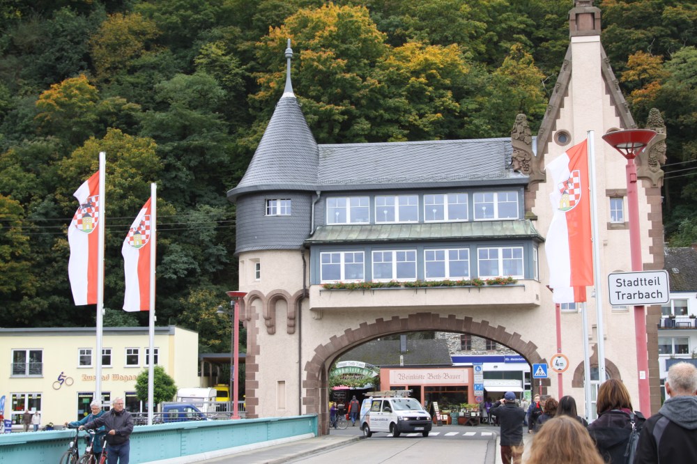 We crossed the main bridge, the Brückentor (or Bridge Gate), designed by the incredibly prolific Bruno Möhring and opened in 1899. From there we were straight into the main street of Trarbach, where a lot of shops seemed to be attracting tourists from the various river boats.