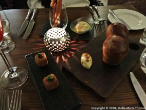 THE OXFORD KITCHEN, AMUSE BOUCHES (PORK AND APPLE GEL CUBES, BRIOCHE AND CARAMELISED BUTTER, FENNEL FLATBREADS, HUMMOUS) 004 Posted by Stella on 21/01/2018
