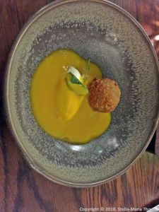 THE OXFORD KITCHEN, TRUFFLED ARANCINI, NUTS AND SEEDS, CREME FRAICHE, BUTTERNUT SQUASH VELOUTE 007 Posted by Stella on 21/01/2018