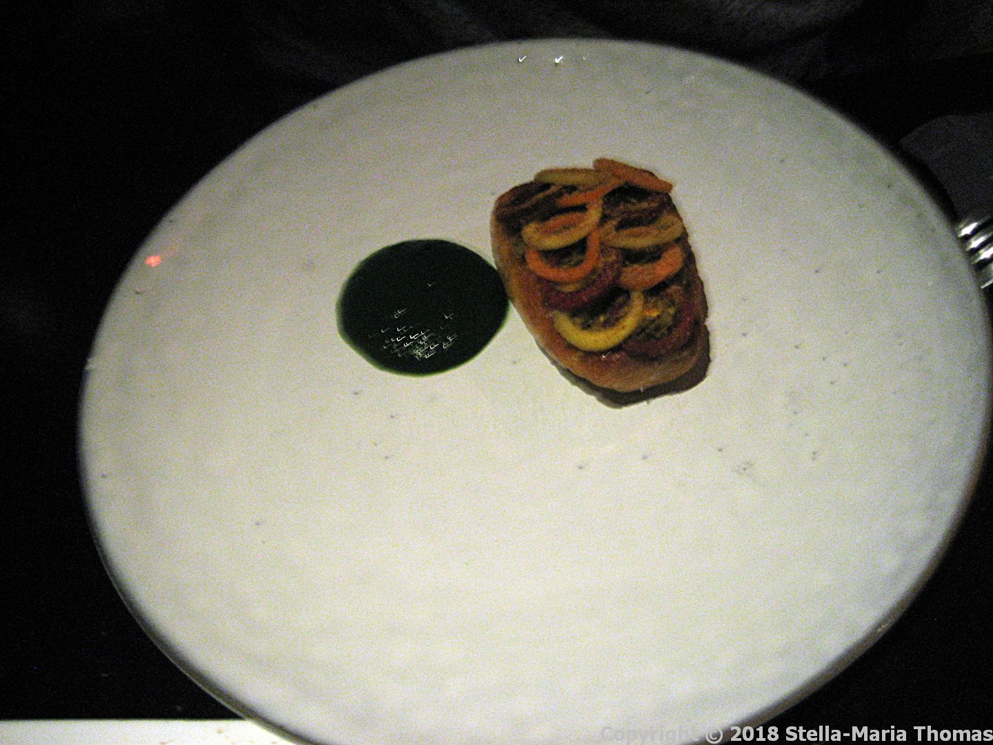 KODBYENS FISKEBAR, COD ROE, SEARED PARSLEY, CARROT AND PICKLED ELDERFLOWER 006 Posted by Stella on 04/04/2018