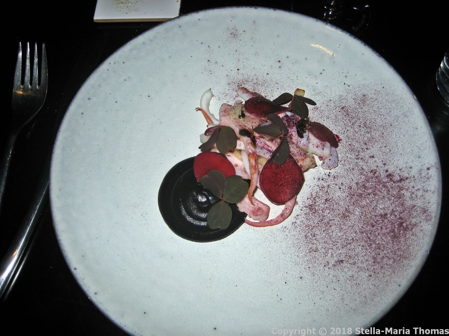 KODBYENS FISKEBAR, SQUID WITH SEARED CELERIAC, BLACK GARLIC, PINE AND BLUEBERRY 010 Posted by Stella on 04/04/2018