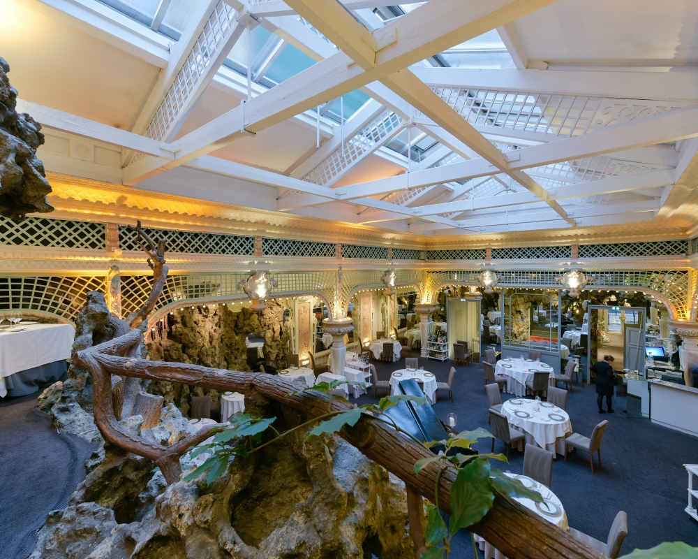 The restaurant also took some finding, and saw us wandering ineffectually round the area where it was supposed to be, and finally finding le Chapon Fin about 10 minutes late. This is probably the oldest restaurant in town, having been in operation since 1825, and it is also one of the very first restaurants in France to be awarded three Michelin stars when the award system started in 1933. It’s fair to say it has history. It was also a favourite watering hole for Toulouse Lautrec, Sarah Bernhardt and Edward VII, among others, many of its famous visitors being commemorated in the demented decor, as this photo from the website shows… It reminded me of the “fake” grotto that makes up some of the Jardins Exotique in Monaco.