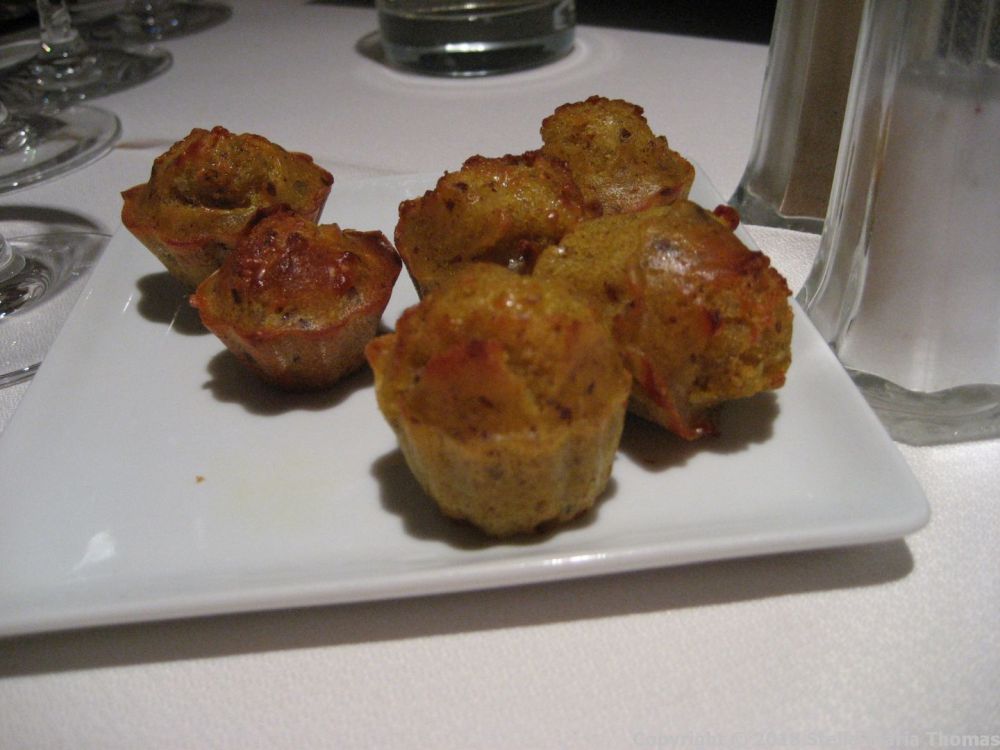 When we arrived we found the place almost completely empty but front of house was very welcoming, and the restaurant has the feel of being in someone’s very well kept and comfy home, especially as we were soon seated in a cosy corner with menus and glasses of Jurançon molleux in front of us. Then came the fun and games of having to translate the menu for those whose French (and especially menu French) is not at the same level as mine. Eventually all seven of us had decided what we were having, with Lynne and I doing the sharing thing as usual. While all that was going on, we were presented with a plate of tiny savoury bakes, full of things like local ham or cheese. These were little doses of comfort food and on what was essentially a cold night, they hit the spot perfectly.