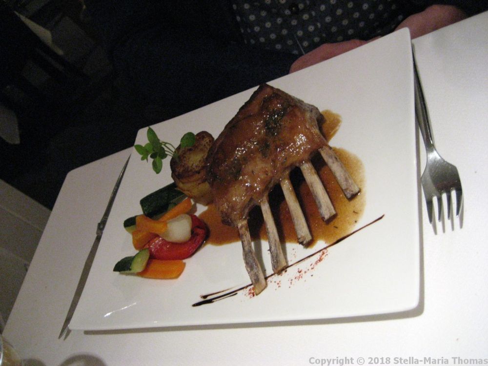 The others chose from prawns, marinated tuna and smoked salmon, with celeriac, Granny Smith apple, and an asparagus flavoured whipped cream portion, or grilled duck breast with blackcurrant jus and red onions or the fisherman’s stew with gentle spices.