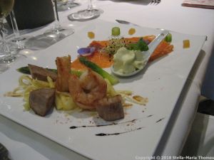 MARC DESTRADE, PAU, GAMBAS, THON MARINE ET SAUMON FUME, CELERI RAVE, POMMES GRANNY ET CHANTILLY D’ASPERGES 006 Posted by Stella on 04/06/2018