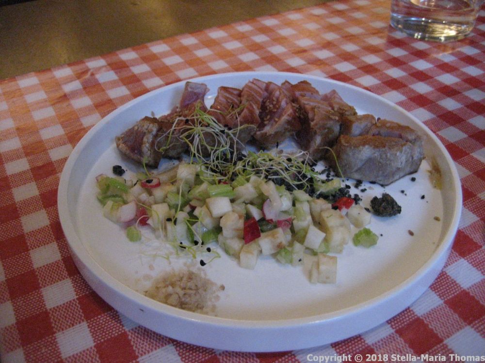 Lynne and R went for the tuna tataki, which was accompanied by a chopped fresh salad of cucumber, celery and radish. The piece I had was very good, tender and juicy and just cooked right.