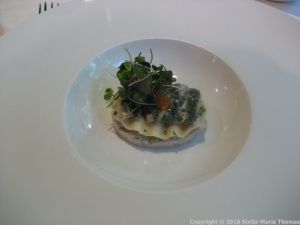 BORAO JATETXEA, BIZKAIA, BERMEO ANCHOVY FILLETS ON TAPENADE TOAST WITH AJOBLANCO GARLIC SOUP 008 Posted by Stella on 04/06/2018