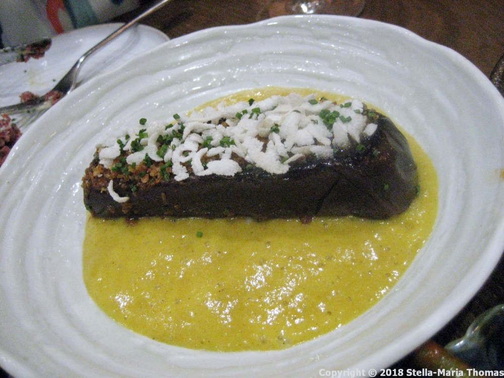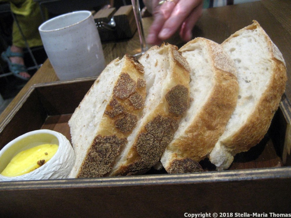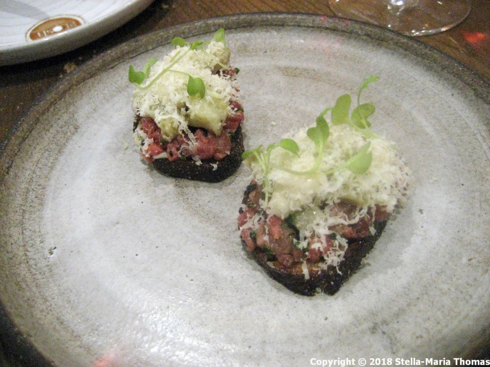 With the fish we went for a carafe of 2016 Gruner Veltliner, Josef Ehmoser, from Wagram in Austria. Very lovely it was too, just fruity enough to stand up to the food, just dry enough not to be cloying. And having got that far it was time to consider the menu one last time, with meat in view. This took us to the rather more expensive end of the short list of options, but was still providing excellent value along with excellent food. The beef tartare Caesar toast, with artichoke tsukemono (a form of Japanese pickled vegetables). The toast was crisp, redolent of Parmesan cheese, and the beef was soft, still recognisably beef rather than having been reduced to pulpy mince by the preparation process. This, as I say, is a very smart kitchen.