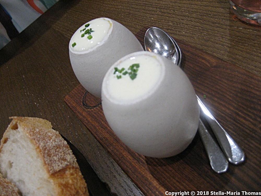 We had a look at the wine list which is smart, imaginative and very good value for money, with pretty much all the wines available by the glass, the carafe or the bottle, and nothing costing more than £40. That’s pretty unusual for a start off, as if the presence of white port on the aperitif list. I can’t recall the last time I saw that in the UK. We had no choice but to order one each of the Nieport ‘White Rabbit’.