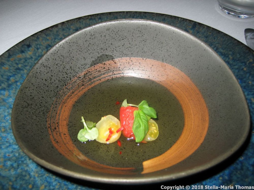 And then we were into the amuses bouche stage, with a tomato salad in tomato essence. This seems to be cropping up a lot of late. It’s simple enough to achieve (though it takes time) but the end result is simply fabulous, with the flavour of the tomatoes distilled into a clear liquid and drizzled all over the tomatoes. All you need are some very good tomatoes, a muslin bag and somewhere to hang it, and a three or four day run at it before you need to use it.