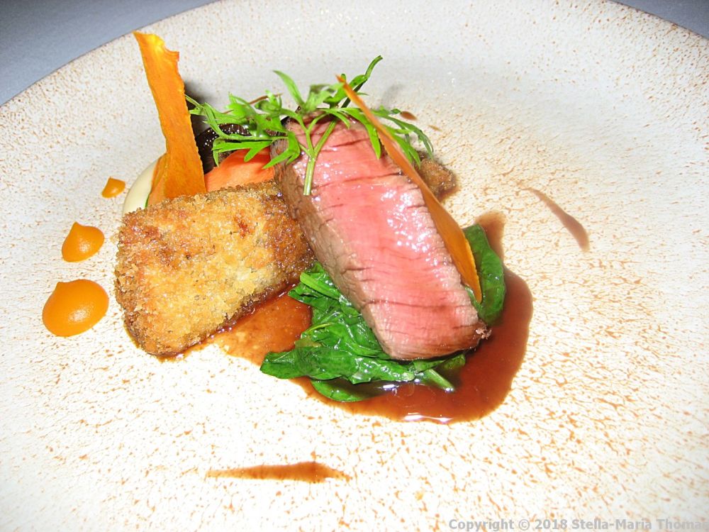 We were squarely back on track with the next course though, local (well Bedfordshire anyway) beef fillet, with horseradish, young carrots and an oxtail croquette (which was frankly fabulous, stuffed full of slow-cooked and pulled oxtail that really hit the spot). The meat was just as we like it, and the carrots were sweet and fresh, both in their original form and as a puree. A small bed of spinach was soaked in the jus and tasted just fine as well.