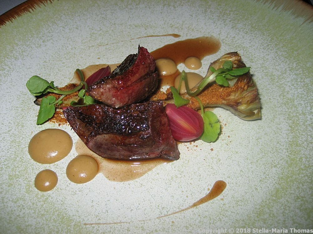 Next up was locally shot wood pigeon, with baby artichokes, and shallots. The meat was perfectly cooked, and the artichoke was very good too. I like artichokes, but really can’t be bothered with the faff of preparing them fresh. When someone else prepares them I am more than happy to take them on. These were soft and nicely done, and went well with the depth of flavour of the meat, and the iron-hit of the rare-coooked flesh. The jus was excellent, and brought the dish together perfectly.