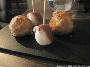 THE OXFORD KITCHEN PROVENCE WINE DINNER, CANAPÉS (QUAIL EGG WITH DUCK HAM, CHEESE AND TRUFFLE PROFITEROLE) 002 Posted by Stella on 21/07/2018