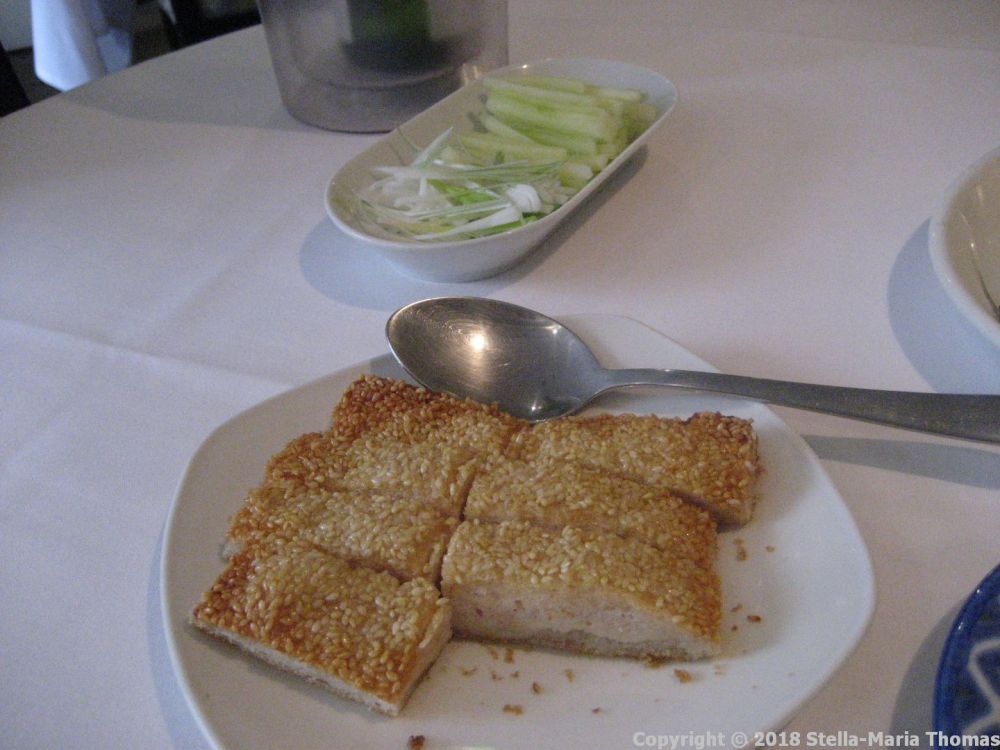 So with no prospect of tapas for dinner, we bickered for a while about where we should go, and finally decided that the Rice Bowl was the only sensible option on a busy Saturday evening. We didn’t want to end up with vast quantities of food, but I do love a prawn toast or two… and theirs are very good ones, with a lovely dense layer of prawns on top and lots of good healthy sesame seeds.