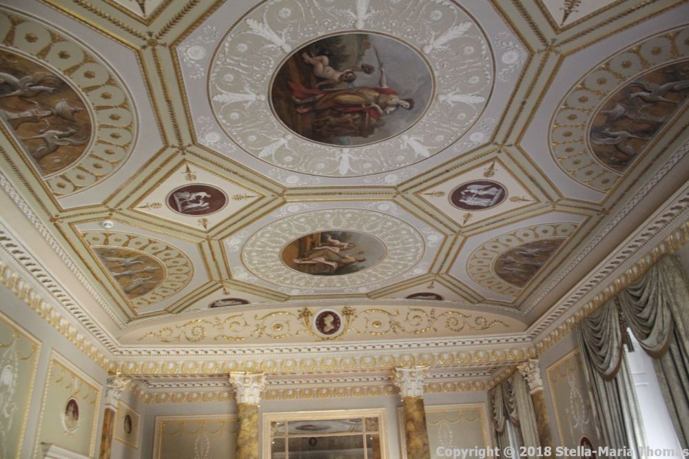 The Dining Room is a lovely space, decorated in a neoclassical style, and it too has had a somewhat chequered history. In 1845 it was redecorated by the architect David Brandon, who replaced the original paintings with polychrome depictions of Dante’s Divine Comedy. The walls were not much changed though, retaining their 18th-century plasterwork. In 1929, Ferdinando stripped the dining room of its panels, mirrors, fireplace and doors and sold them to Crowther’s, a firm of architectural antique dealers. They were sold to what was until last year the Waldorf Astoria Hotel in New York where they formed the Basildon Room. Lord and Lady Iliffe opted to redecorate it in a style similar to the original scheme by de Bruyn, using Carr’s surviving plasterwork, and a fireplace and doors salvaged from Panton Hall to return the room to its original neoclassical form.