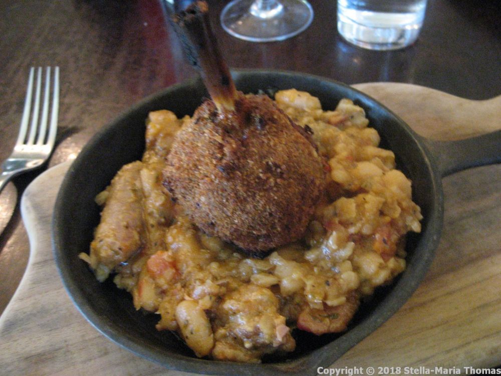 It made me quite glad that my dish looked substantially smaller. It was absolutely delicious, comfort food in a small, cast iron frying pan. A gloriously gooey, sticky, savoury cassoulet, studded with chunks of chorizo, pork, smoked bacon and some tiny Toulouse sausages, and capped with a bon-bon of confit duck leg meat, coated in breadcrumbs (traditional on top of a more conventional cassoulet) and fried to a crisp coat. It was quite the best cassoulet I’ve eaten this year, and given we spent two weekends in Pau that’s high praise. It’s still not fine dining; it’s a hug in a pan.