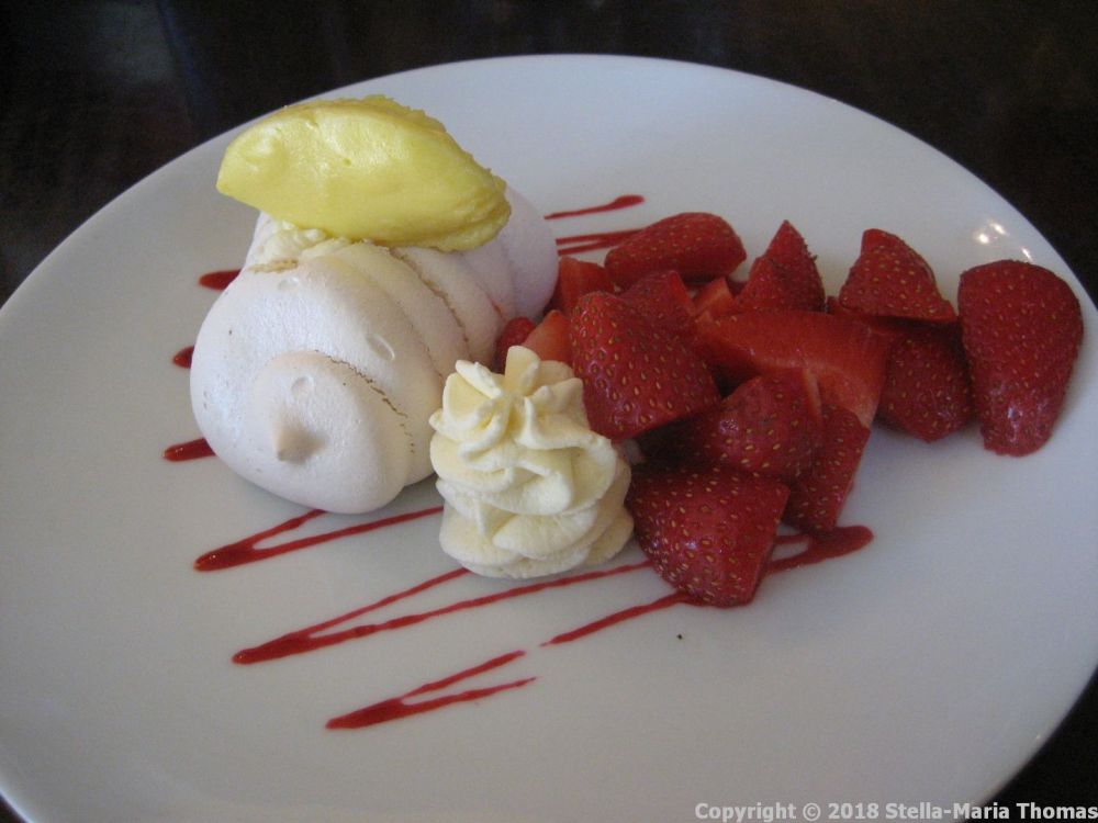 I had the strawberry Pavlova, which might almost have been called deconstructed, but was none the worse for that. The strawberries were perfectly fresh and sweet, and the meringue was not too sweet, with a vanilla-flavoured custard-like quenelle for contrast. It was a light and delicious end to lunch.