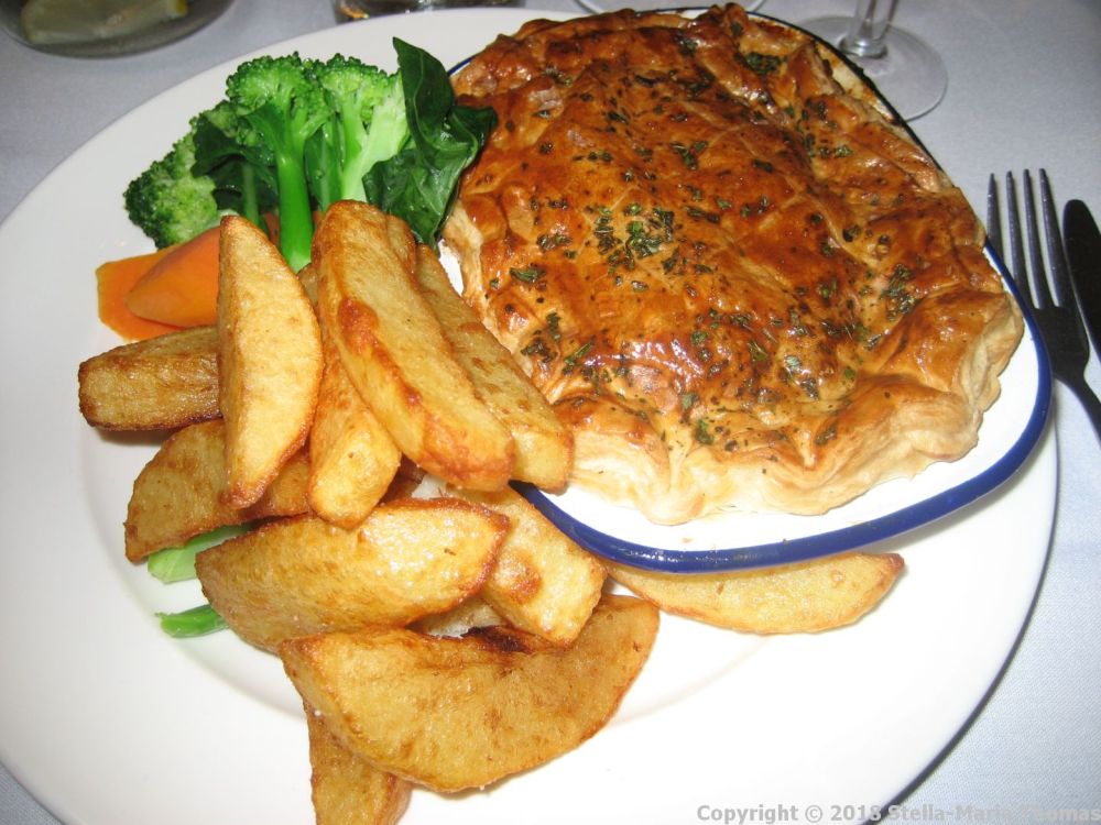 I decided that despite it being August the weather justified the pie of the day, in this instance a beef Bourguignon pie, with thrice fried chips, and vegetables. The pie was delicious, full of tender chunks of beef, tiny onions, mushrooms and lardons, in a very rich gravy. It was everything I could have hoped for. The chips were not all that good, sadly. They were somewhat flaccid for chips that should have been crispy from going through the frying process three times. A later conversation with the landlord revealed that the normal species of potato that they use for their chips were unavailable; the substitute variety was not as good. I did suggest they should maybe temporarily remove chips from the menu, but he said he couldn’t do that because there’d be a riot. I suppose he had a point…