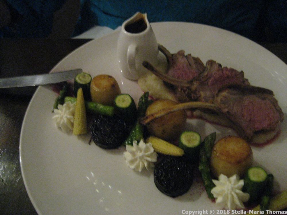 The other meat dish was a rack of lamb, again prettily served and perfectly cooked, the skin crisp and the meat soft, tender and pink. There were baby sweetcorn, beetroot, courgettes, fondant potatoes and asparagus, and another well-executed sauce, sticky and meaty and redolent of red wine. What it was, in addition to delicious (and this was true of the duck as well) was far too big for either of us to be able to eat all of it, which was a bit of a shame, but the lovely waiting staff were more than happy to pack the leftovers up for us to take home – lunch the following day was assured.