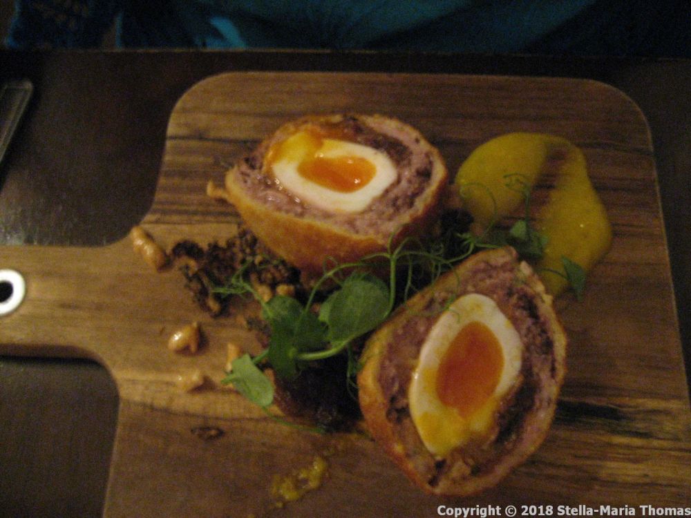 Anyway, once I could drag my attention away from the “ooh! shiny!” table, and study the menu, we sorted our options, deciding that we would be sharing the dishes again because it was too hard to opt for just one starter and one main. I am forever grateful that I live and travel with someone who is happy to go half and half on most dishes, because after all, there are so many restaurants, and so little time. The first dish to arrive was a lovely, soft-yolked Scotch egg, made with wild boar sausage meat. I do love a good Scotch egg, and this was definitely a good one.