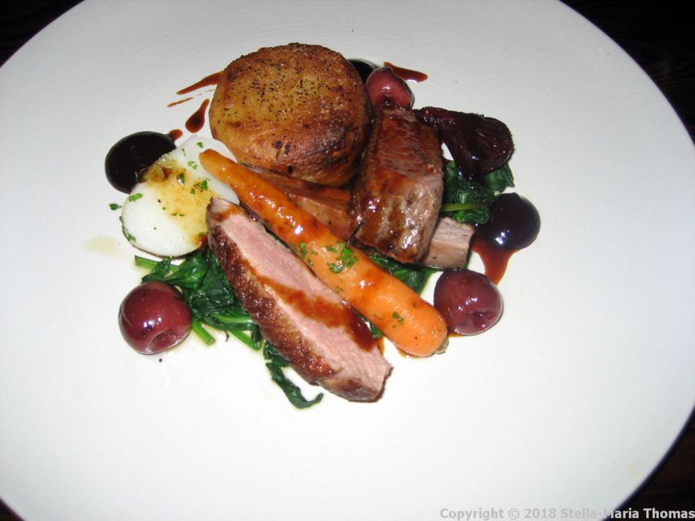 The other main was another classic, this time an oven roasted Barbary duck breast, with crispy skin and perfectly pink flesh. It was accompanied by baby vegetables, a well executed fondant potato and a glossy, sticky delicious sauce, dotted with black cherries.